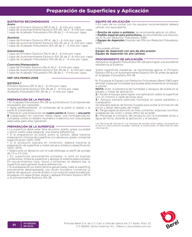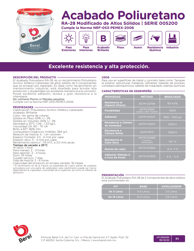 El Acabado de Poliuretano Transparente RA-28, es un recubrimiento Poliuretano Acrílico Alifático Catalizado de altos sólidos de 2 componentes que se envasan por separado. Es ideal como recubrimiento en mantenimiento industrial, está diseñado para brindar alta protección y durabilidad con excelente resistencia a la corrosión. Posee excelente adhesión, dureza y gran resistencia a la intemperie.