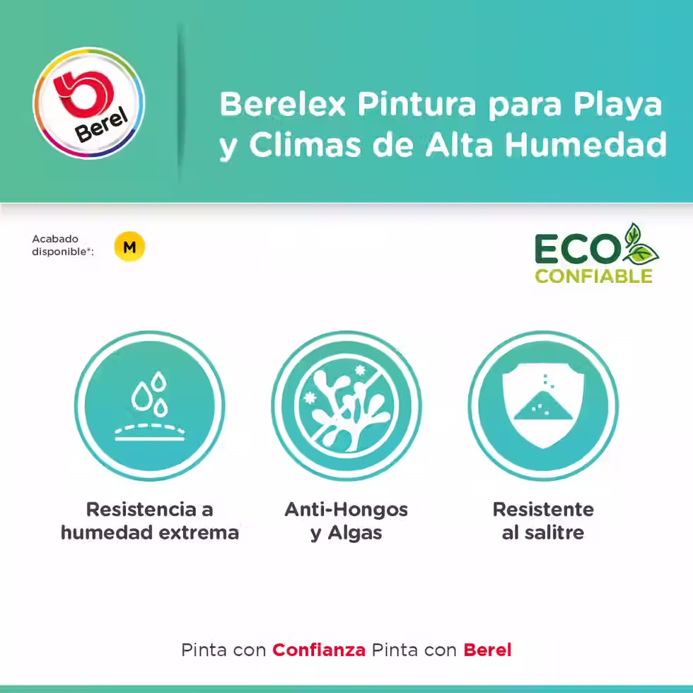 Berelex Pintura para Playa y Climas de Alta Humedad es una pintura 100% Acrílica resistente a climas tropicales, para exteriores e interiores, de acabado mate, alta resistencia a la alcalinidad, hongos, rayos UV y humedad extrema. Una de las características principales de Berelex Pintura para Playa y Climas de Alta Humedad es la de resistir condiciones de extremo calor y humedad, además de evitar la formación de salitre e inhibir el crecimiento de bacterias, hongos y algas sobre la superficie pintada, ofreciendo excelente retención de color y facilidad de limpieza. Esta pintura NO contiene plomo.