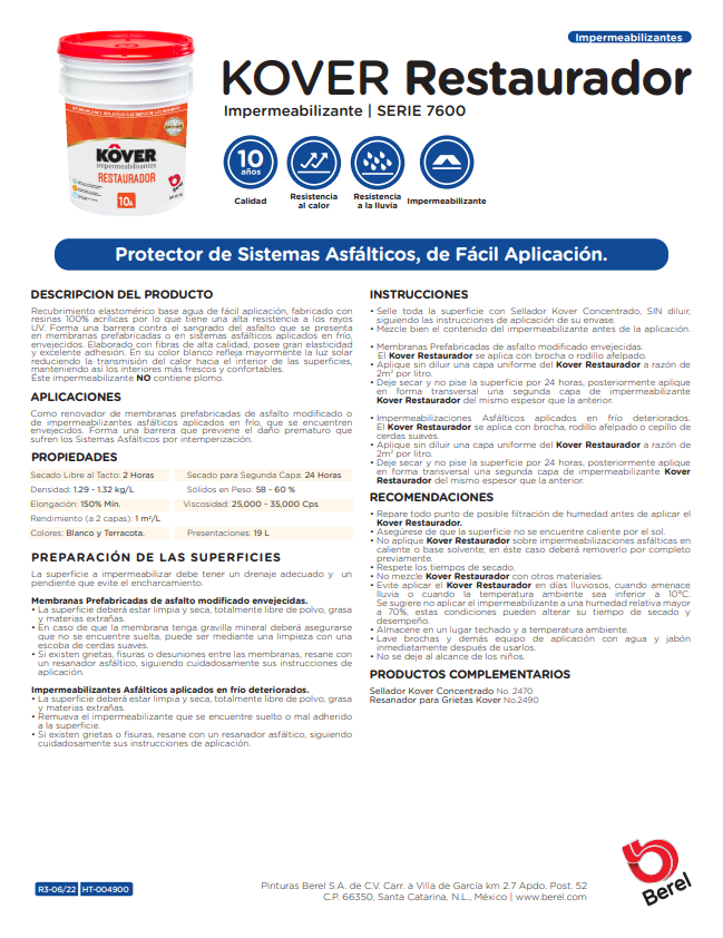 Recubrimiento elastomérico base agua de fácil aplicación, fabricado con resinas 100% acrílicas por lo que tiene una alta resistencia a los rayos UV. Forma una barrera contra el sangrado del asfalto que se presenta en membranas prefabricadas o en sistemas asfálticos aplicados en frío, envejecidos. Elaborado con fibras de alta calidad, posee gran elasticidad y excelente adhesión. En su color blanco refleja mayormente la luz solar reduciendo la transmisión del calor hacia el interior de las superficies, manteniendo así los interiores más frescos y confortables. Éste impermeabilizante NO contiene plomo.